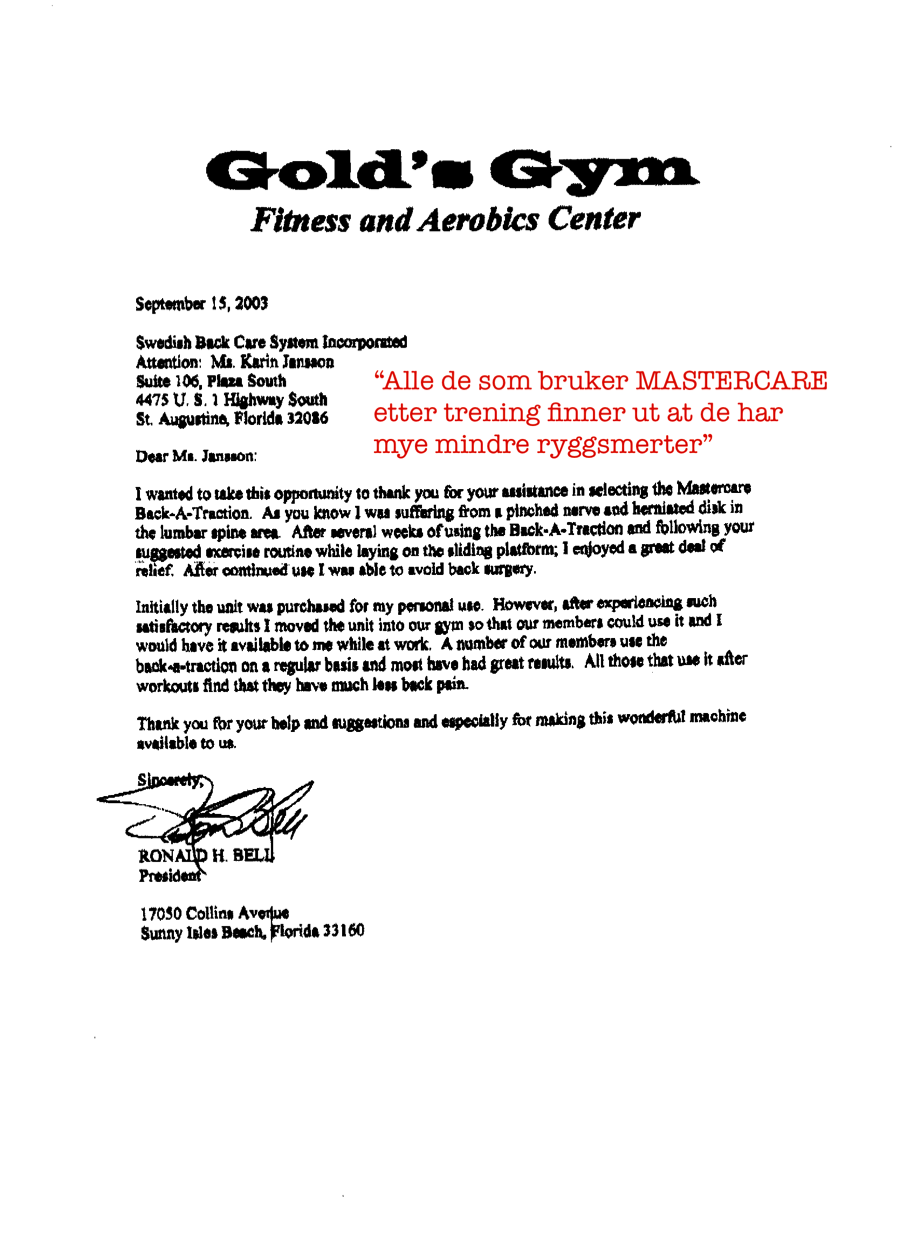 MASTERCARE er ideell ikke bare for ryggplager og leddene i rygg og nakke, men også for oppvarming eller avslapning etter en økt i treningsstudioet. Her er et brev fra en takknemlig bruker på Golds Gym.